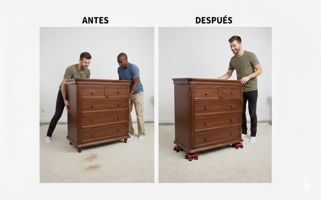 Desliza muebles hasta +150kg sin esfuerzo. Nuestra base industrial protege tus suelos de cualquier rayón